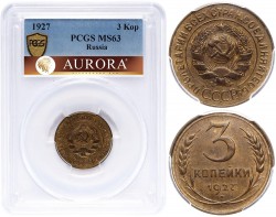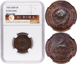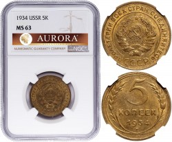 5 копеек 1929 года. Алюминиевая бронза. Сохранность MS65. В слабе NGC. ТОП-грейд. В базе NGC только 2 монеты в этом грейде. Редкие.