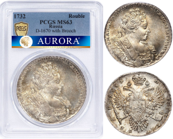 1 рубль 1732 года. С брошью на груди. Скипетр с трилистником. PCGS MS63. ТОП-грейд