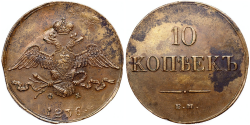 10 копеек 1836 года. Екатеринбургский монетный двор. ЕМ-ФХ. Медь 46,64 г. Биткин № 469. Сохранность аUNC, легкий штемпельный блеск, отличный прочекан, красивая монета кабинетного хранения, слева от орла возможно выглаживание царапины. Редкие в такой высокой степени сохранности.